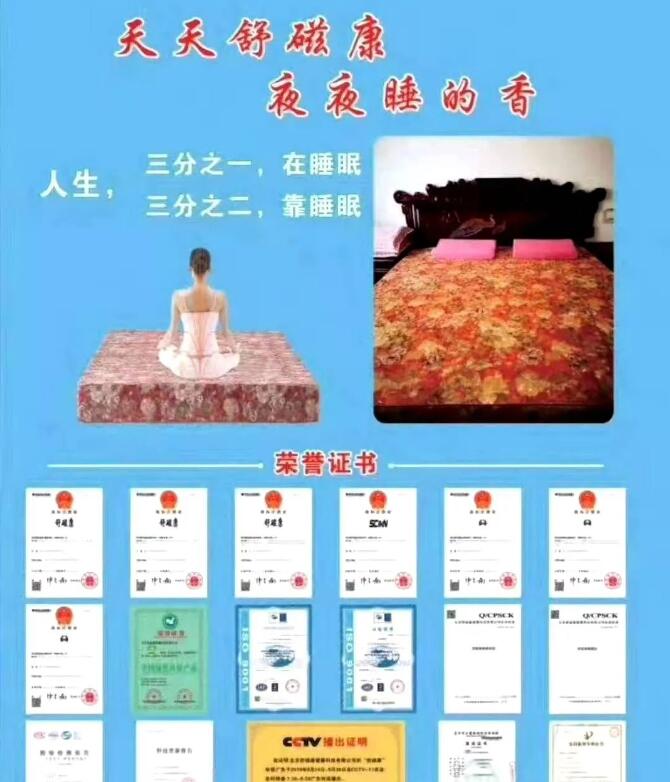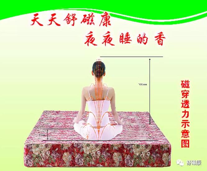 它的面料考究,提花刺繡,上面有舒磁康標(biāo)識。就象我們穿的毛衣,如果是化纖的,在脫的時候,是不是會有靜電,靜電偷走了我們的負電荷,使紅細胞聚集,對我們的健康危害很大。而舒磁康地磁床墊,一是防靜電,再一個圖案非常漂亮,所有人都喜歡牡丹花,它的立體感和層次感都非常強。有直觀的防偽作用。